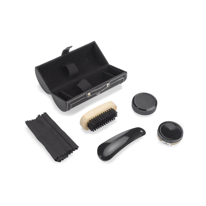 Zestaw do czyszczenia obuwia SHINBO wykonany z materiału skóropodobnego (PU). Zawiera pastę bezbarwną, czyścik, łyżkę do butów, ściereczkę i szczotkę.