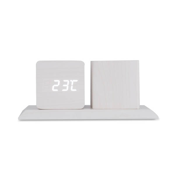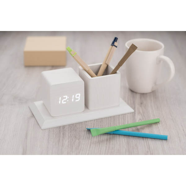 Organizer na biurko wykonany z płyty MDF o modnym wykończeniu w kolorze jasnego drewna, który świetnie pasuje do nowoczesnych pomieszczeń. Posiada pojemnik na długopisy oraz zegar z funkcjami: kalendarza, alarmu oraz termometru.