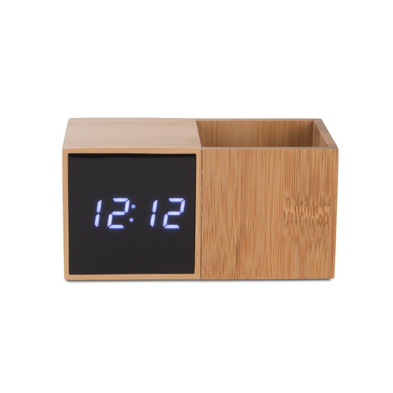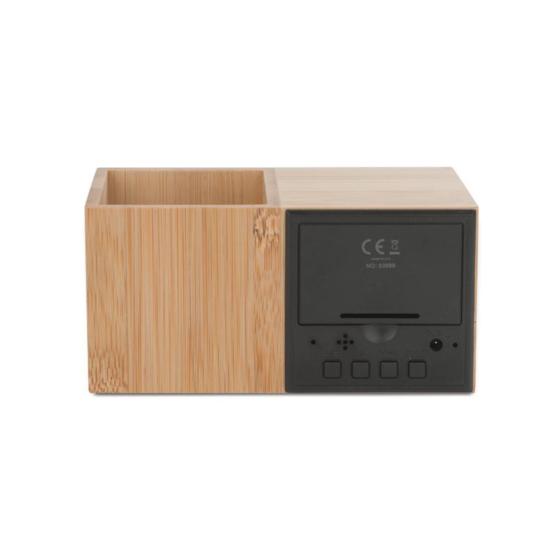 Zegar z przybornikiem BAMBOO w ekologicznym wydaniu wykonany z bambusa spełni oczekiwania osób szukających modnych dekoracji i dbających o środowisko. Bambusowa obudowa świetnie współgra z czarnym zegarem. Białe światło LED na wyświetlaczu. Posiada pojemnik na długopisy oraz zegar z funkcjami: kalendarza, alarmu oraz termometru.