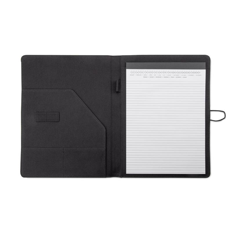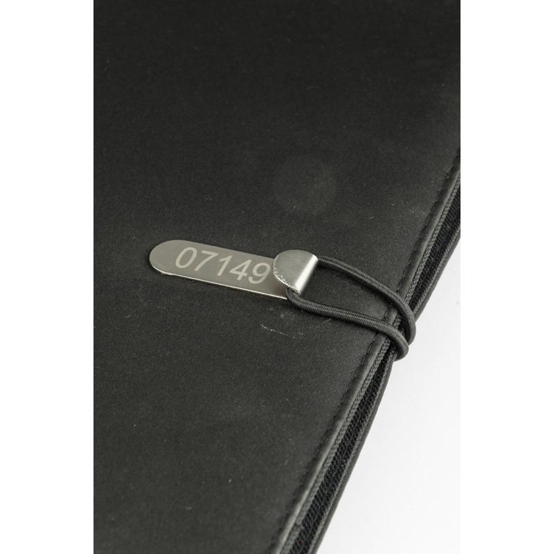 Prosta teczka o nowoczesnym wyglądzie. Zawiera dużą kieszeń, małe kieszonki, 2 miejsca na USB, miejsce na długopis, notes. Teczka zapinana na gumkę zaczepianą o metalowy haczyk.Wykonana z mikrofibry i poliestru. Notes nie jest umocowany na stałe, ale wsuwany w kieszonkę, dzięki czemu można go łatwo wymienić. Logo wygrawerujemy na metalowym haczyku.