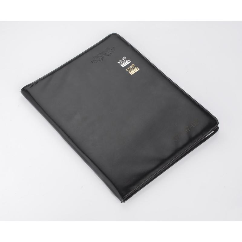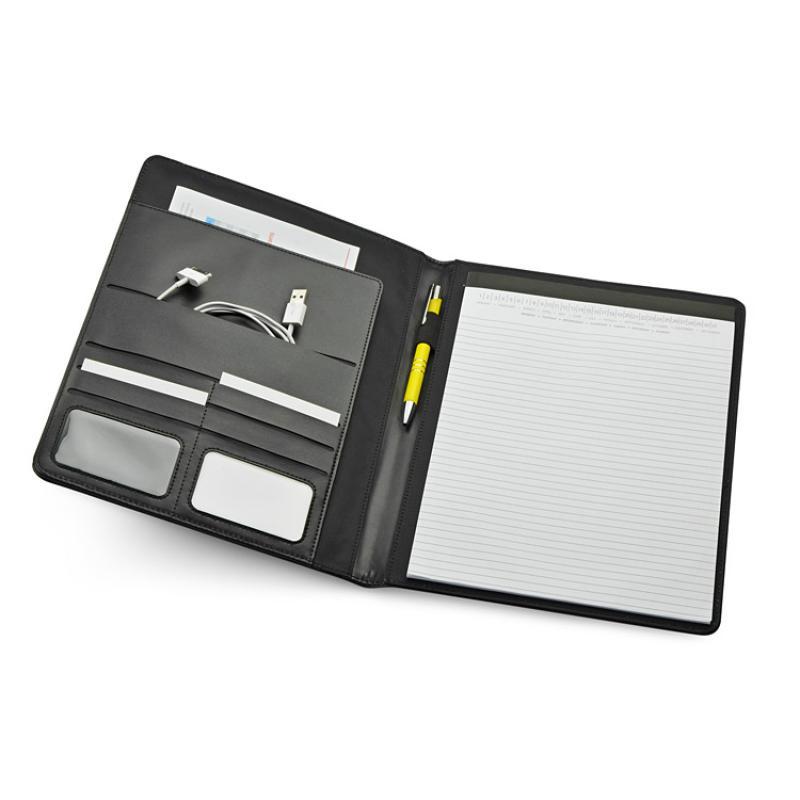 Elegancka, klasyczna teczka wykonana z materiału skóropodobnego (PU). Wewnątrz 1 duża kieszeń na dokumenty, 1 średnia kieszeń oraz 6 małych kieszonek np. na wizytówki. Wyposażona jest w notes w linie (20 kartek A4). Notes nie jest umocowany na stałe, ale wsuwany w kieszonkę, dzięki czemu można go łatwo wymienić. Logo można wykonać wieloma technikami na powierzchni teczki.