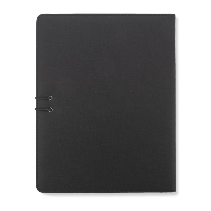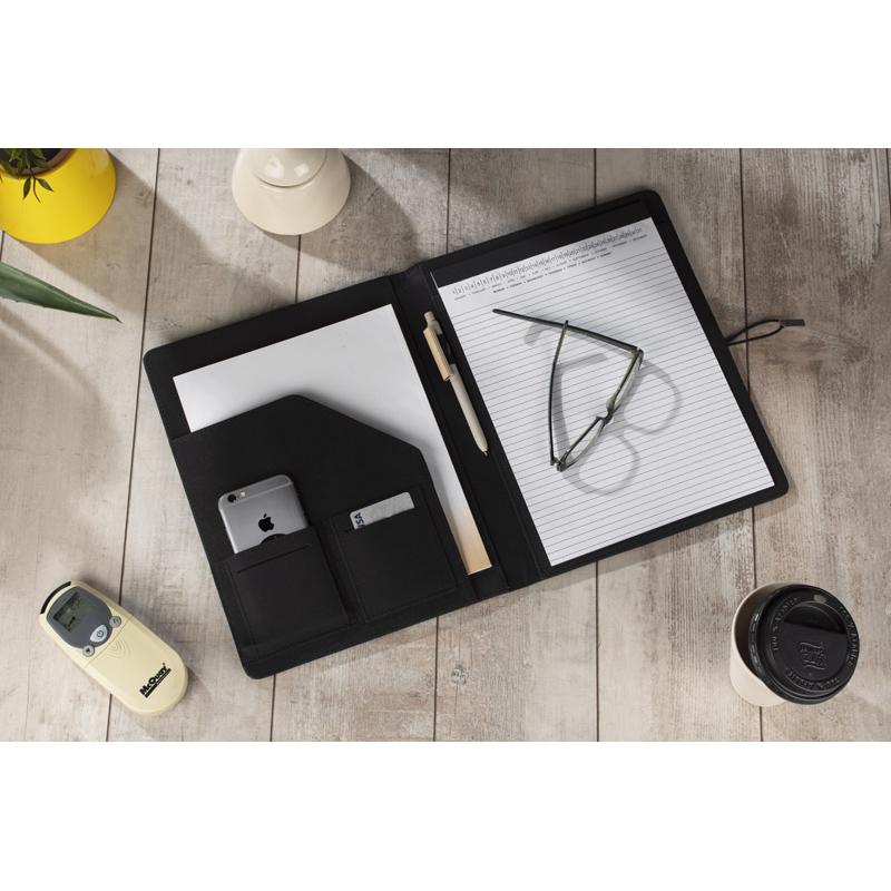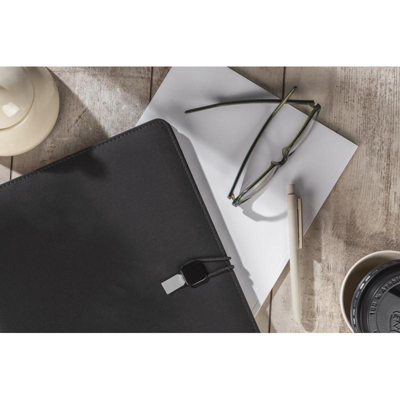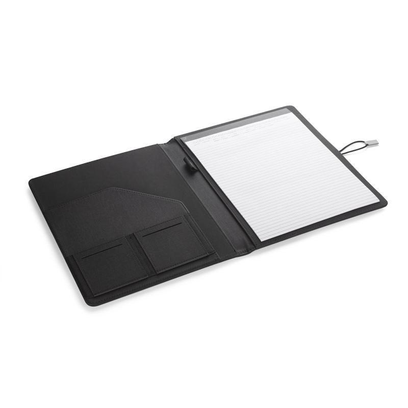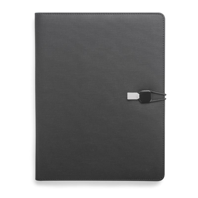 Teczka konferencyjna TELLA zamykana na gumkę zakończonąmateriałem skóropodobnym (PU) w kolorze szarym, która ułatwia otwieranie teczki i jednocześnie stanowi ciekawą i elegancka ozdobę . Zawiera jedną kieszeń do przechowywania dokumentów, dwie mniejsze kieszonki, miejsce na długopis i wizytówki oraz notes o formacie A4 z możliwością jego wymiany.