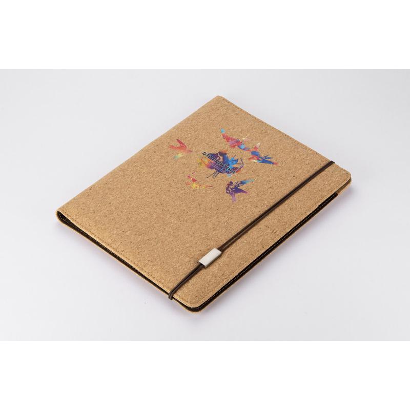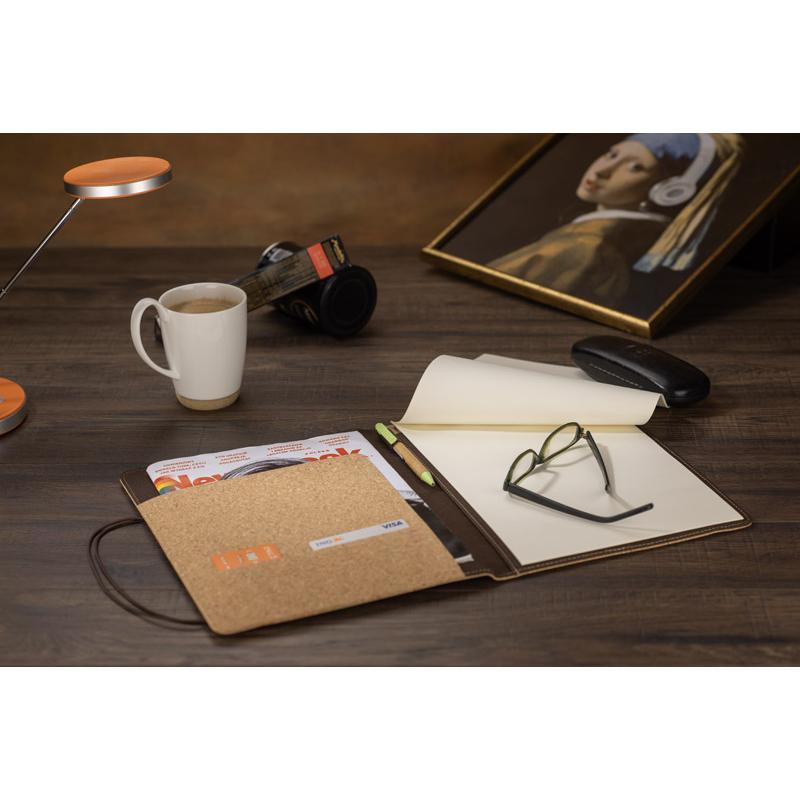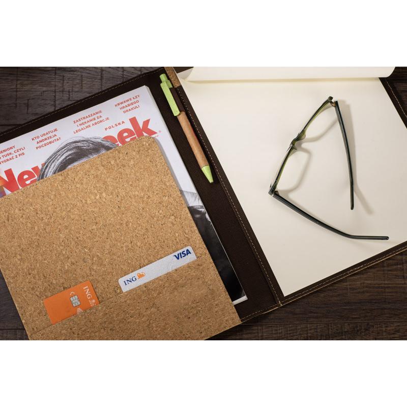 Korkowa teczka A4 z notatnikiem. Zawiera dużą kieszeń do przechowywania dokumentów, dwie mniejsze kieszonki oraz miejsce na długopis. Zamykana za pomocą gumki z metalowym elementem. Zapakowana w woreczek non woven.