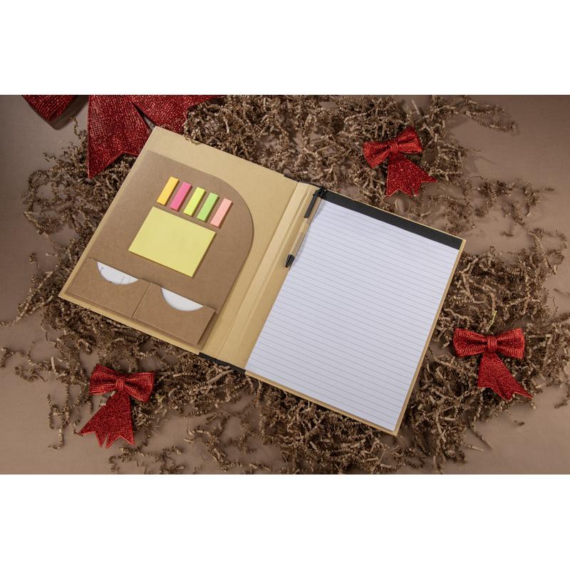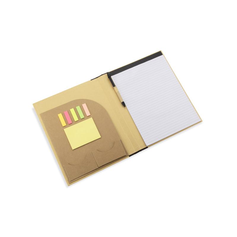 Teczka konferencyjna A4 DOSI to wszechstronny i praktyczny gadżet, idealny na spotkania biznesowe i konferencje. W jej wnętrzu znajduje się notes w linie, kieszeń na dokumenty oraz dwie mniejsze kieszonki na wizytówki i notatki. Teczka jest usztywniana i wyposażona w papierowy długopis, żółte karteczki samoprzylepne oraz zestaw małych karteczek idealnych do zaznaczania ważnych miejsc w notatkach. DOSI jest zamykana na gumkę, co zapobiega zgubieniu dokumentów. Wyprodukowana z papieru, który stanowi ekologiczną alternatywę dla teczek z materiałów syntetycznych.