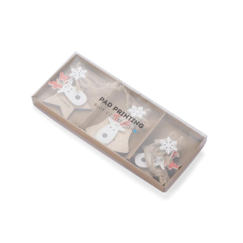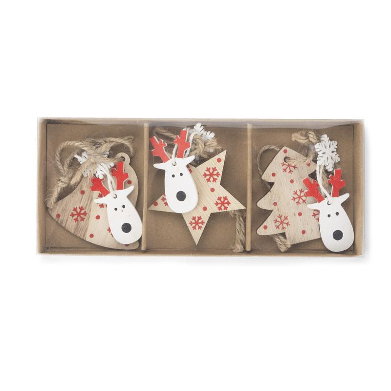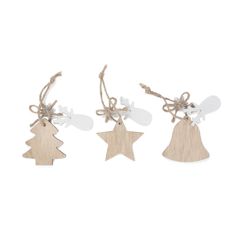 Zestaw FERI składa się z 3 sztuk drewnianych zawieszek o różnych wzorach: gwiazdka, choinka, dzwoneczek. Drewniane zawieszki idealnie wpisują się w trend ekologiczny pasując niemal do każdego wnętrza.