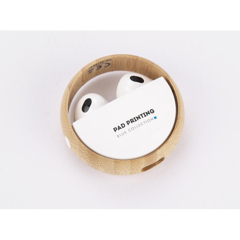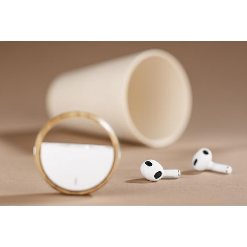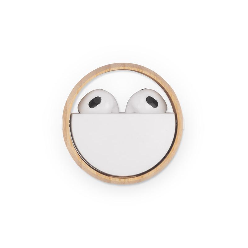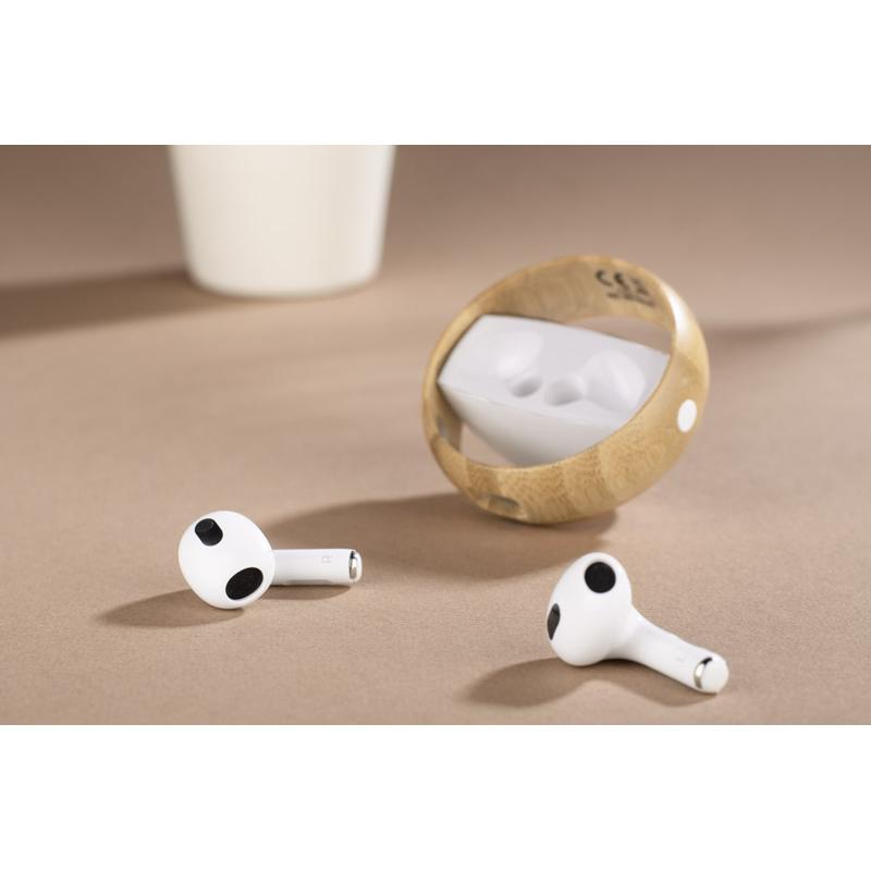 Słuchawki bezprzewodowe SPOTI to stylowy i nowoczesny gadżet. Zapakowane w poręczne okrągłe etui, które poprzez połączenie bieli i bambusa prezentuje się bardzo efektownie. Poręczny, mały rozmiar pozwoli cieszyć się wygodą użytkowania. Dane techniczne: wersja bluetooth 5.0, pojemność baterii w każdej słuchawce 30mAh, pojemność baterii w etui 230 mAh, czas pracy 3-4 godziny, czas ładowania 1-2 godziny, port ładowania typu C.