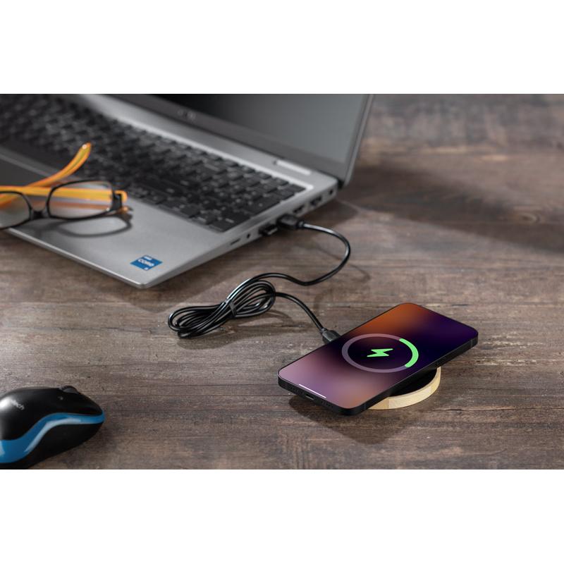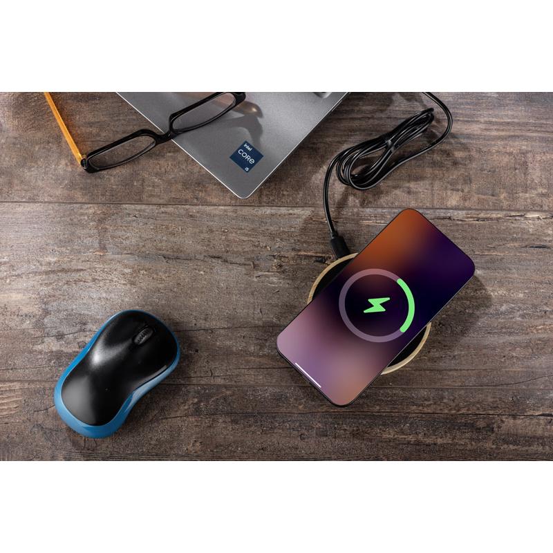Okrągła ładowarka indukcyjna FRESTI 15W z obudową wykonaną z naturalnego bambusa. Dzięki lekkiej i smukłej konstrukcji jest poręczna i estetyczna. Odłączany czarny kabel zapewnia wygodę użytkowania. Doskonała jako gadżet promocyjny, łączący nowoczesną technologię z naturalnym designem.