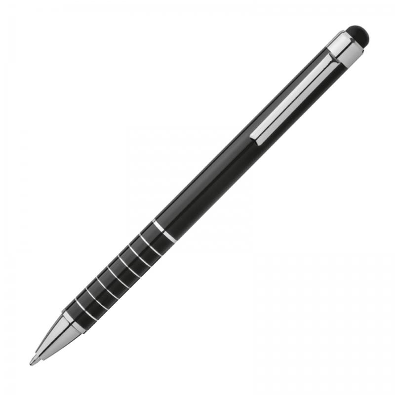 Długopis metalowy z mechanizmem obrotowym i gumką do obsługi ekranów dotykowych. Posiada wkład piszący na niebiesko.