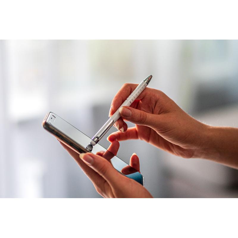 Długopis metalowy z mechanizmem obrotowym i gumką do obsługi ekranów dotykowych. Posiada wkład piszący na niebiesko.
