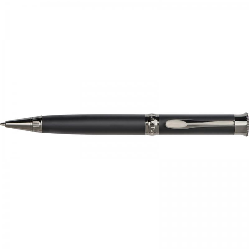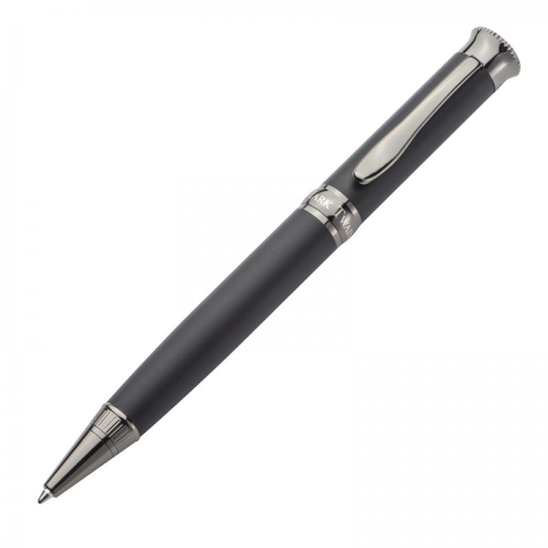 Metalowy długopis marki Mark Twain z chromowanymi elementami i dużym wkładem piszącym na niebiesko. Zapakowany w eleganckie etui.