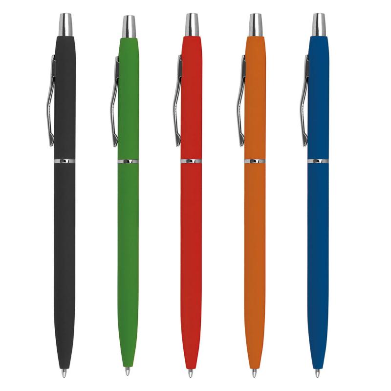 Smukły, gumowany długopis metalowy z wkładem piszącym na niebiesko.