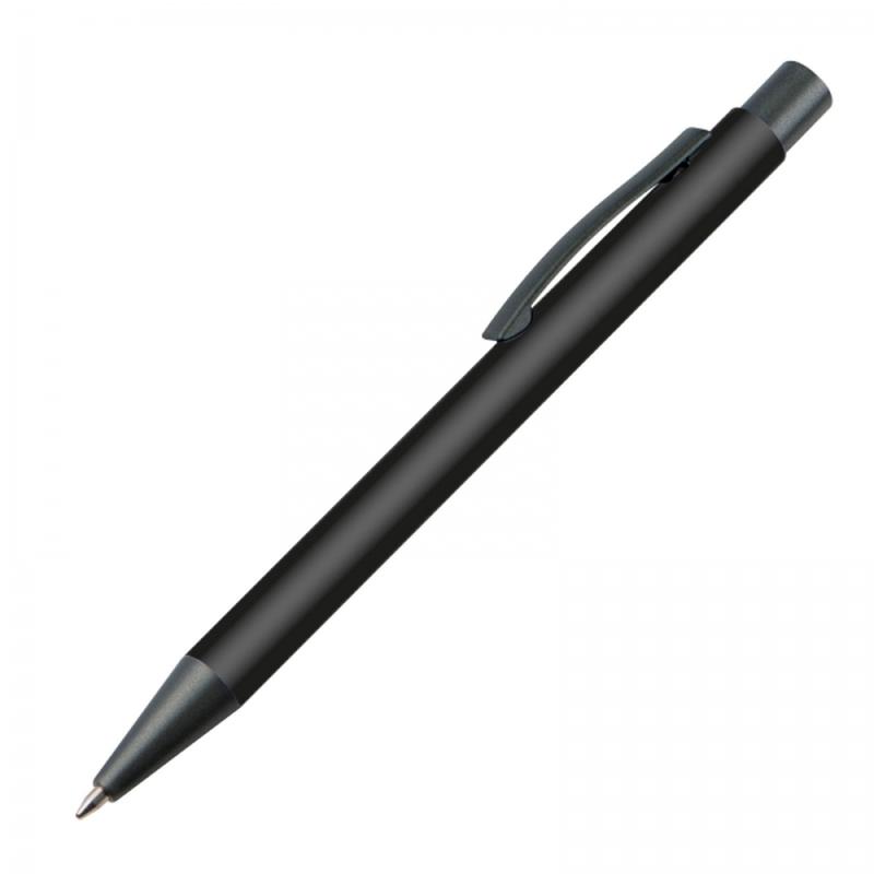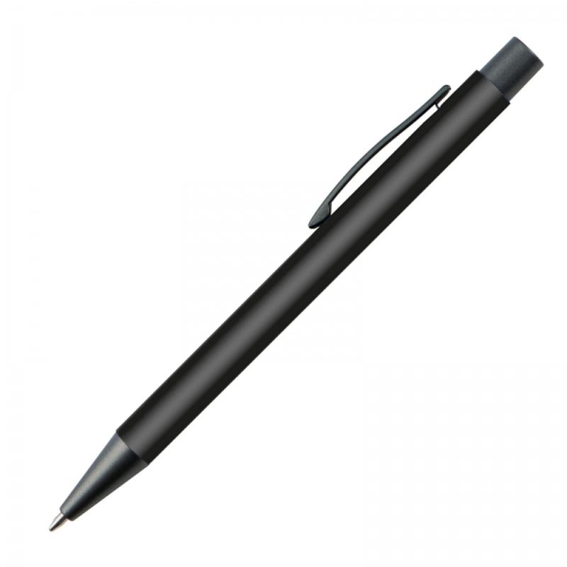 Plastikowy długopis z niebieskim wkładem, kolorową obudową i metalowym klipsem.