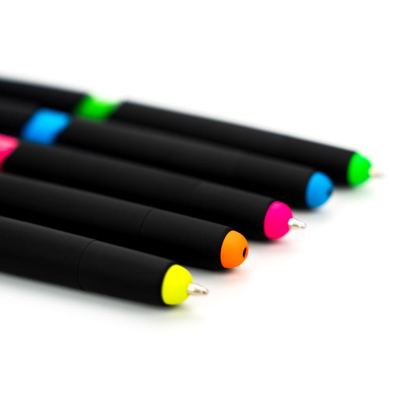 Plastikowy długopis z zakreślaczem. Posiada gumowaną powierzchnię, wkład piszący na niebiesko i końcówkę do obsługi ekranów dotykowych.