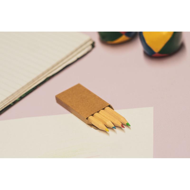 Kredki drewniane w czterech kolorach, umieszczone w małym kartoniku.