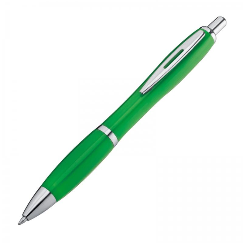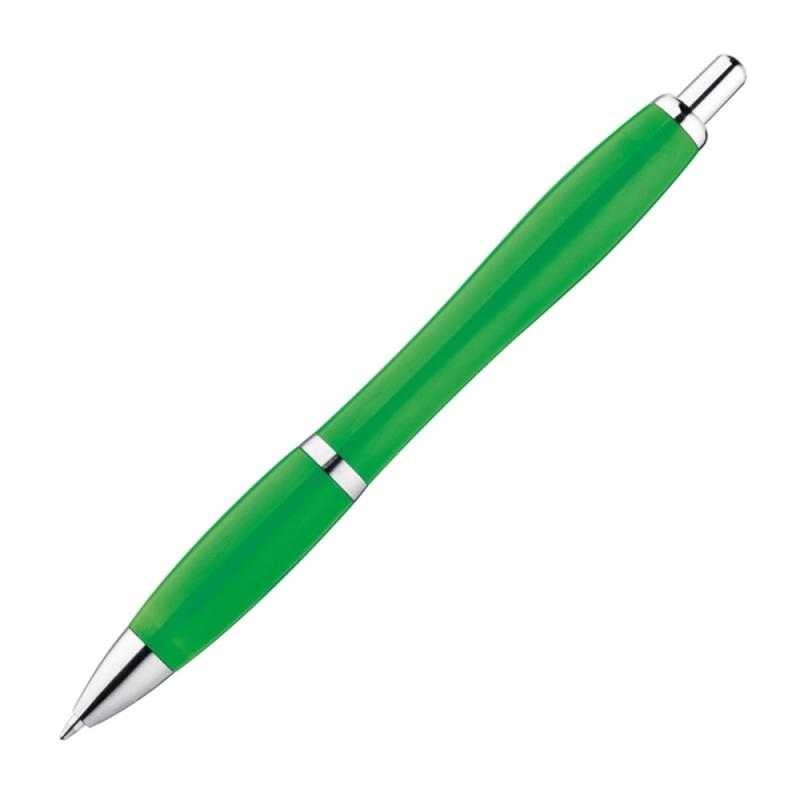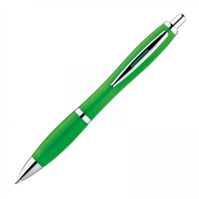 Klasyczny długopis plastikowy z metalowym klipsem i dużym, niebieskim wkładem.