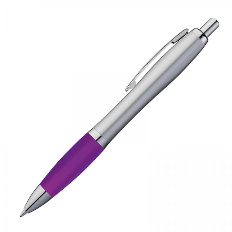 Plastikowy długopis z satynowym połyskiem, metalowym klipsem, gumowanym korpusem i dużym niebieskim wkładem.