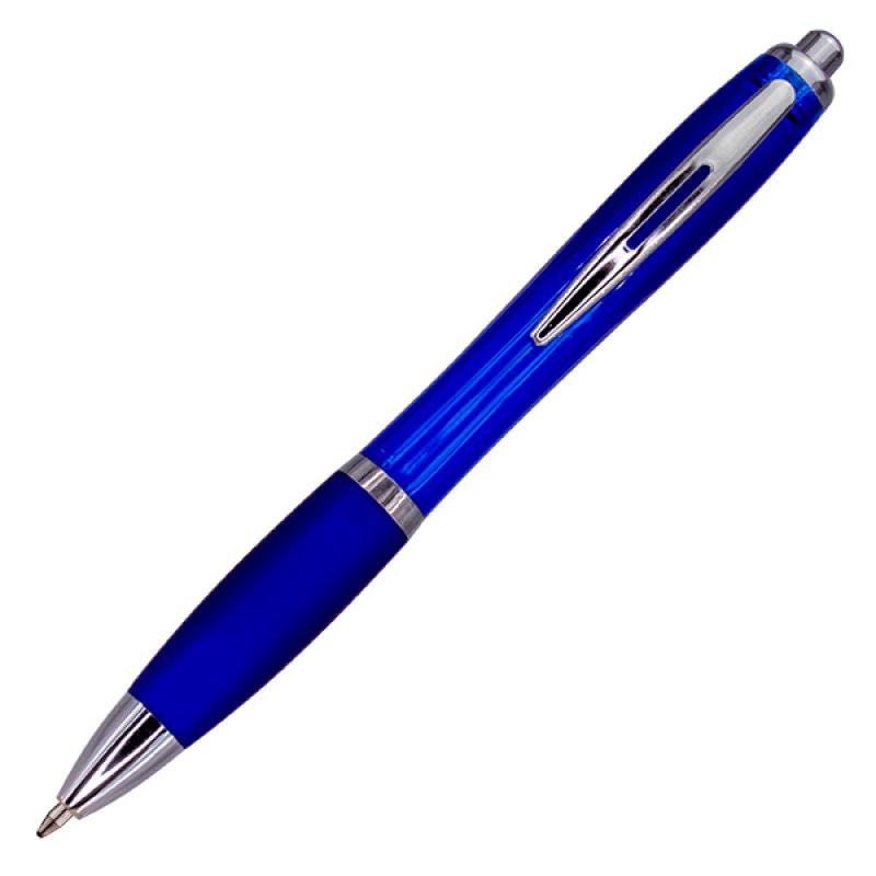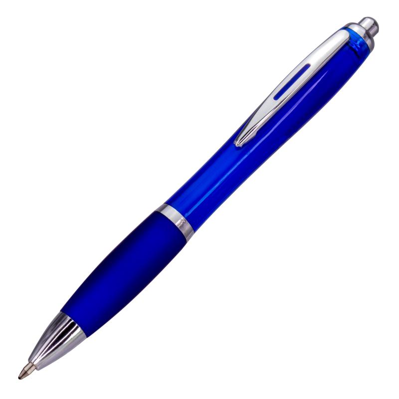 Plastikowy, transparentny długopis z dużym niebieskim wkładem, gumowaną strefą uchwytu i metalowym klipsem.