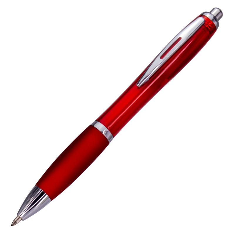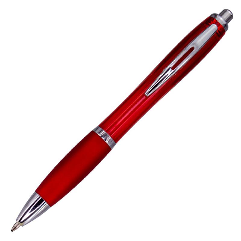 Plastikowy, transparentny długopis z dużym niebieskim wkładem, gumowaną strefą uchwytu i metalowym klipsem.