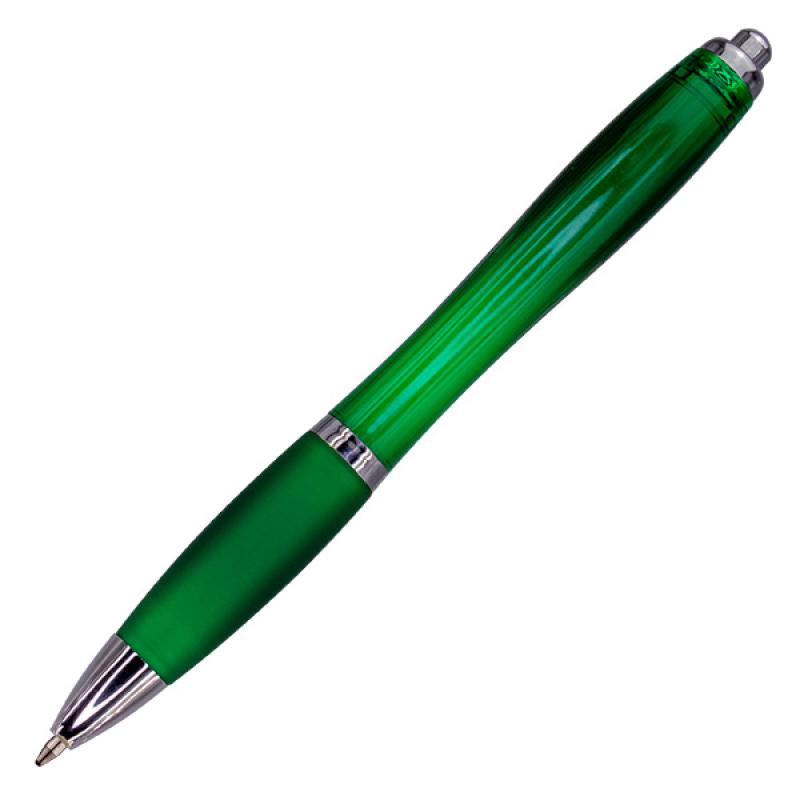 Plastikowy, transparentny długopis z dużym niebieskim wkładem, gumowaną strefą uchwytu i metalowym klipsem.