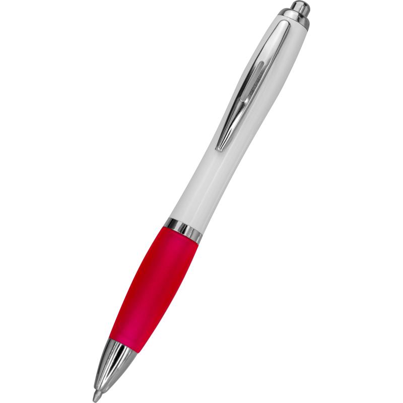 Długopis plastikowy z białym korpusem i kolorową gumką ułatwiającą trzymanie. Wyposażony w metalowy klips i duży wkład piszący na niebiesko.