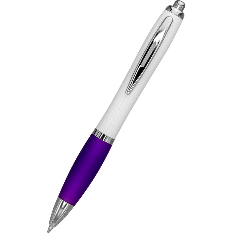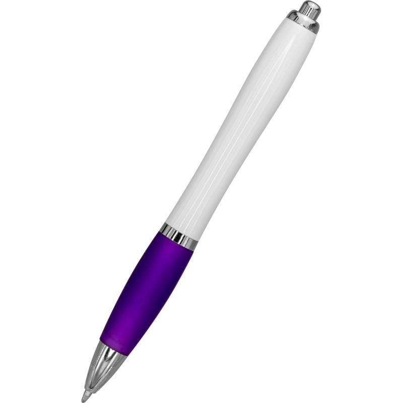 Długopis plastikowy z białym korpusem i kolorową gumką ułatwiającą trzymanie. Wyposażony w metalowy klips i duży wkład piszący na niebiesko.