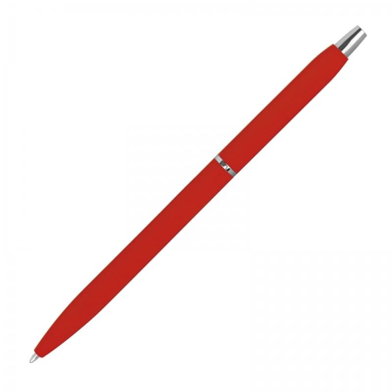 Metalowy długopis o gumowanej powierzchni ze srebrnymi akcentami. Posiada wkład piszący na czarno.