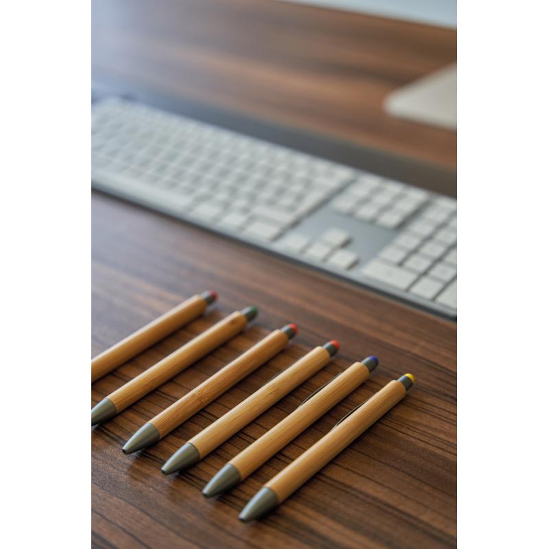Bambusowy długopis z niebieskim wkładem, antracytowymi elementami i z gumką do obsługi ekranów dotykowych.