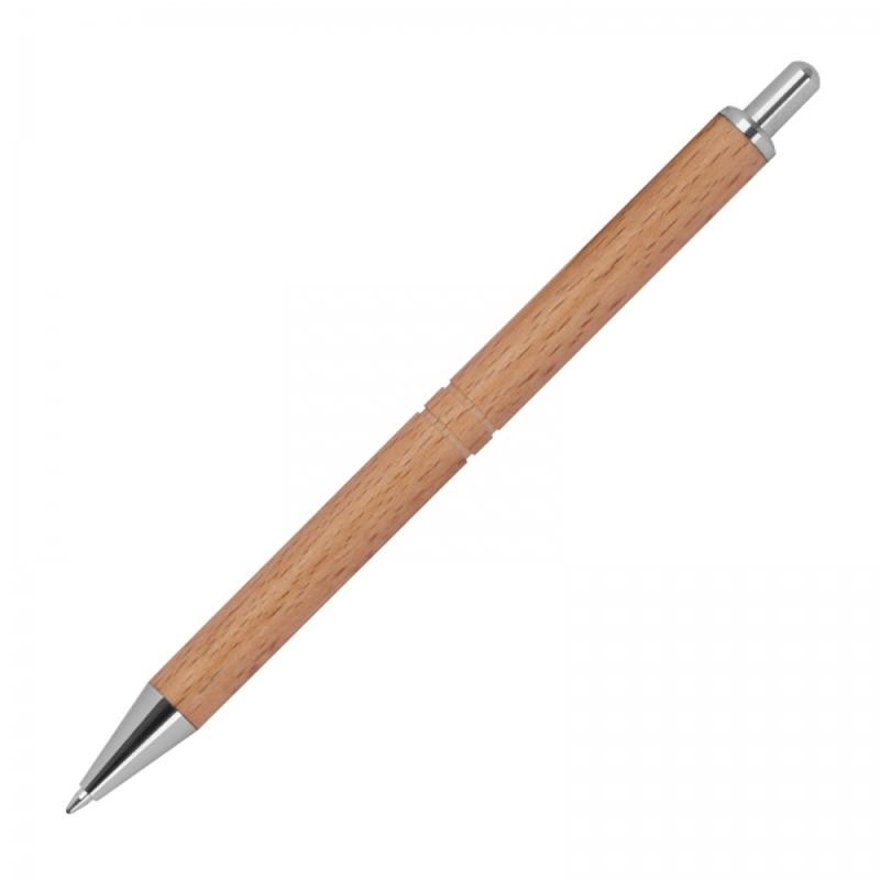 Długopis z naturalnego, polerowanego drewna oraz metalu, z wkładem piszącym na niebiesko.
