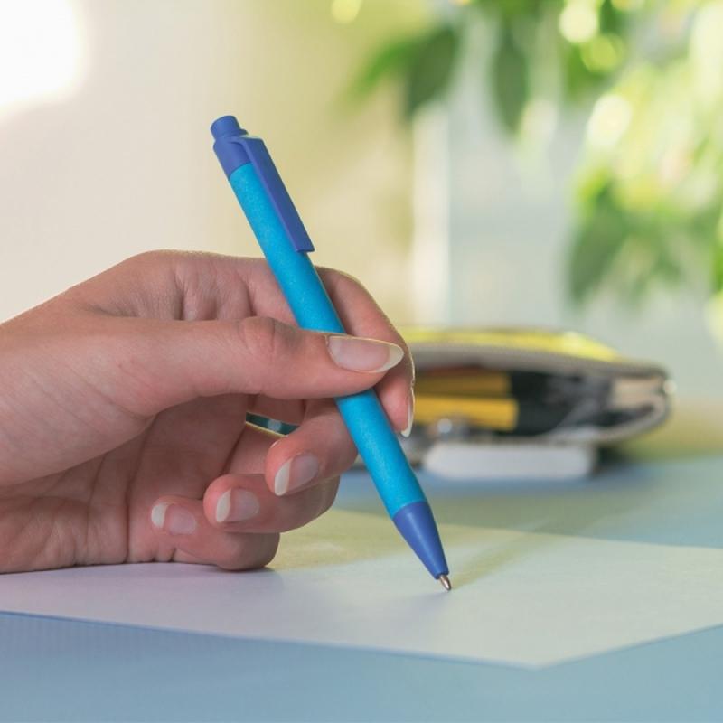 Ekologiczny długopis wykonany z tektury (pochodzącej z recyklingu) oraz specjalnie utwardzanych włókien kukurydzianych (końcówka pisząca, klips i mechanizm wysuwania wkładu). Długopis posiada niebieski wkład.