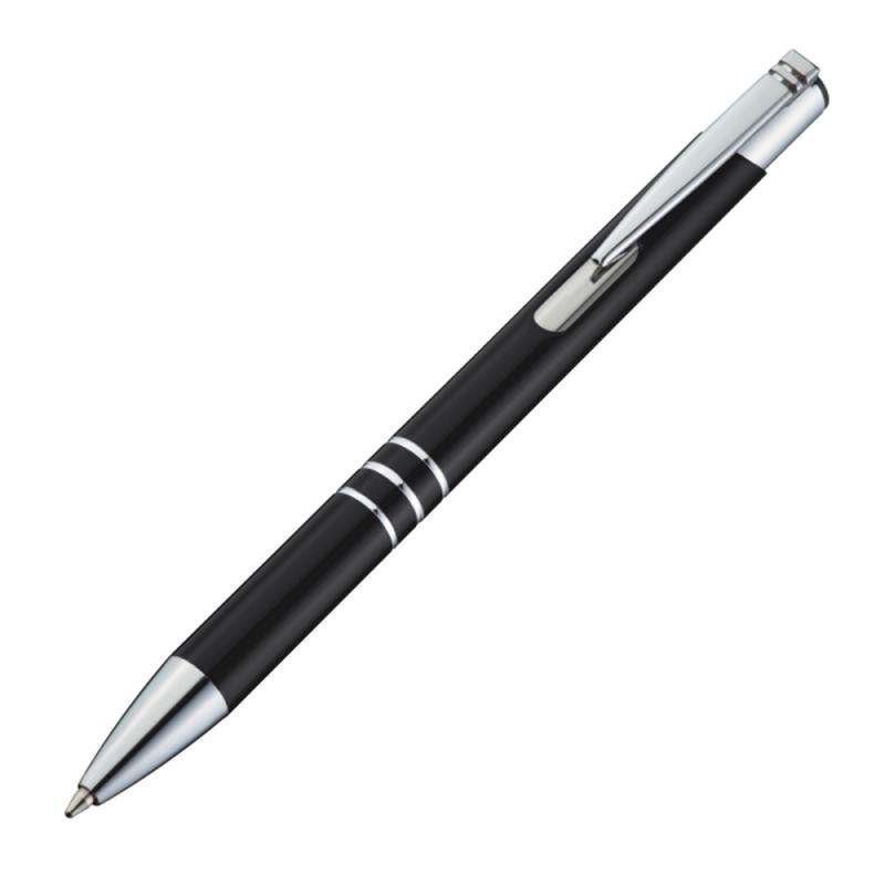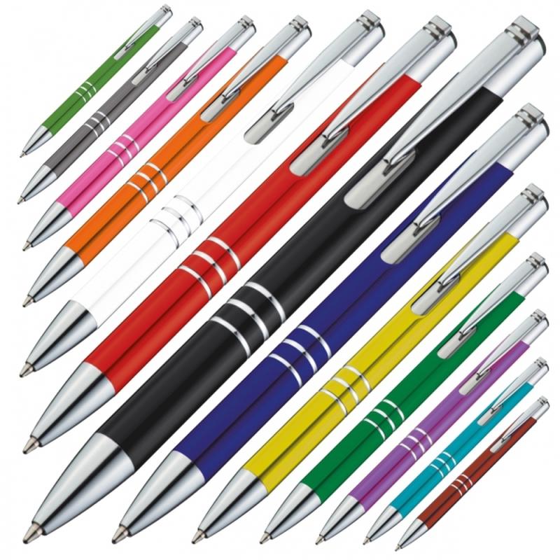 Klasyczny długopis metalowy z chromowanymi elementami i smukłym klipsem. Długopis wyposażony w duży niebieski wkład.