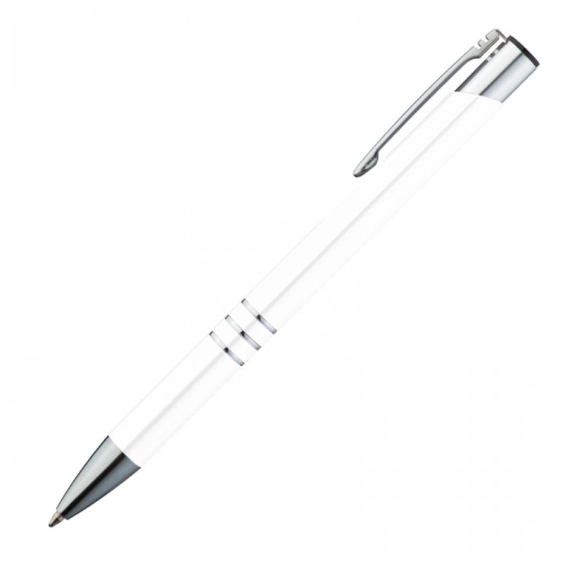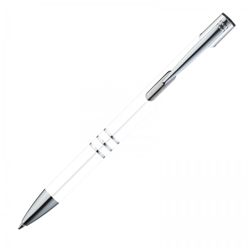 Klasyczny długopis metalowy z chromowanymi elementami i smukłym klipsem. Długopis wyposażony w duży niebieski wkład.