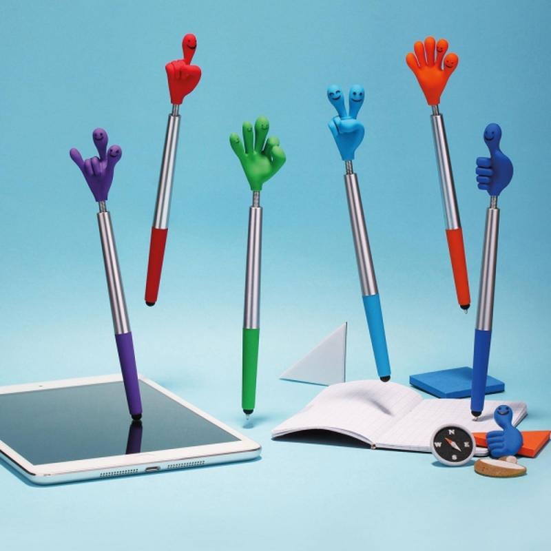 Długopis CrisMa Smile Hand posiada niepowtarzalny design. Wesoły dodatek w postaci gumowej łapki pokazującej sympatyczne gesty i końcówka do smartfonów sprawiają, że będzie to światny gadżet promocyjny.