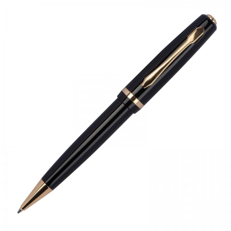 Metalowy długopis ze złotymi aplikacjami i niebieskim wkładem.