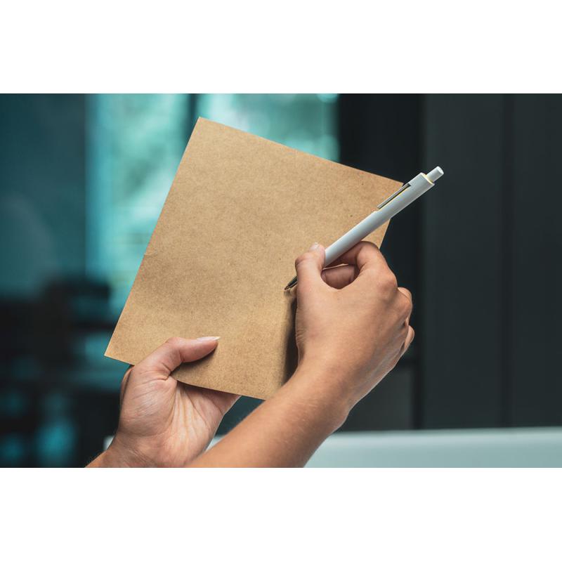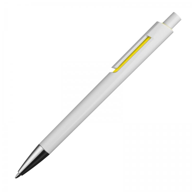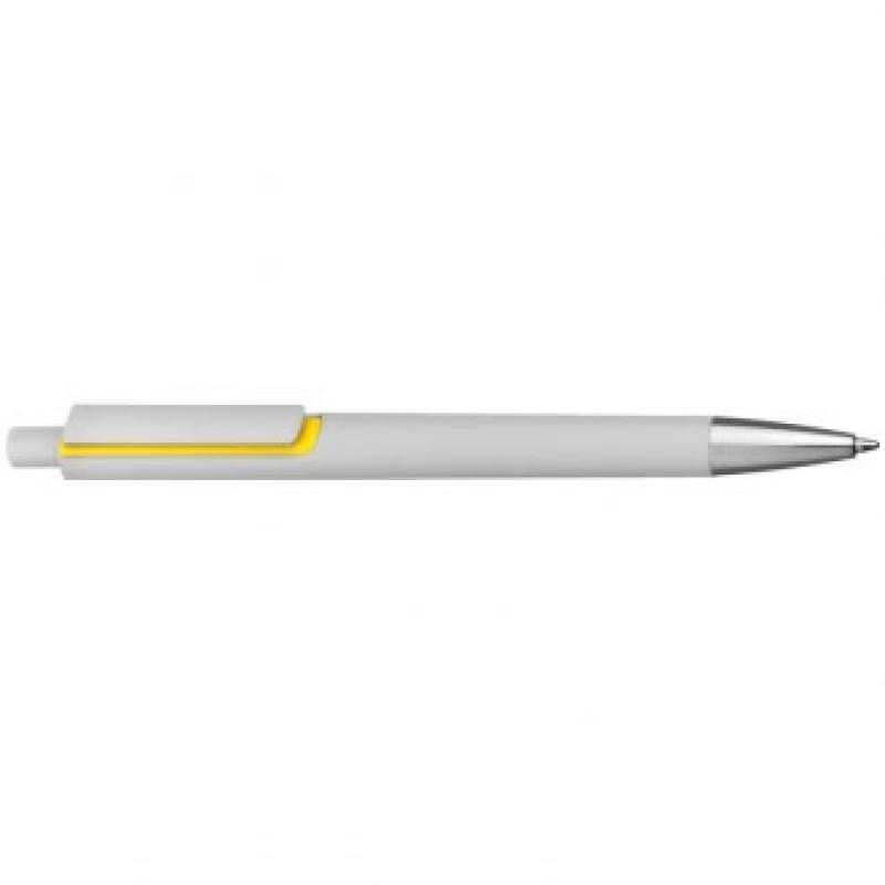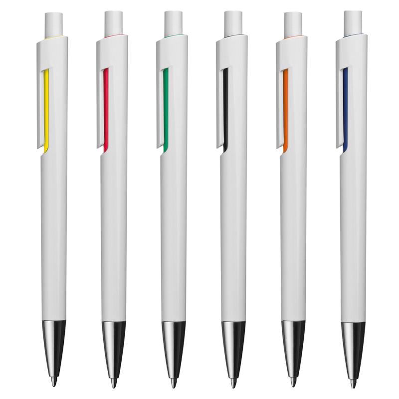 Plastikowy długopis z wkładem piszącym na niebiesko. Długopis posiada białą obudowę i kolorową aplikację pod klipem.