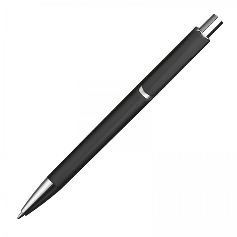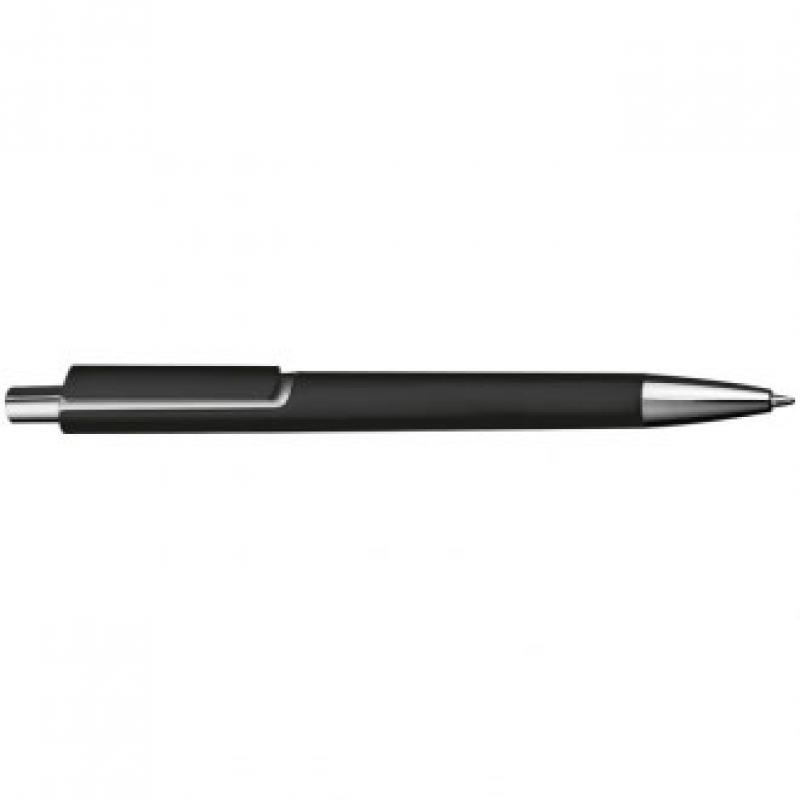 Plastikowy długopis z wkładem piszącym na niebiesko i srebrną aplikacją pod klipem.