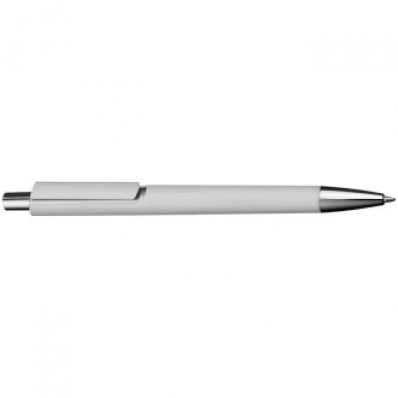 Plastikowy długopis z wkładem piszącym na niebiesko i srebrną aplikacją pod klipem.