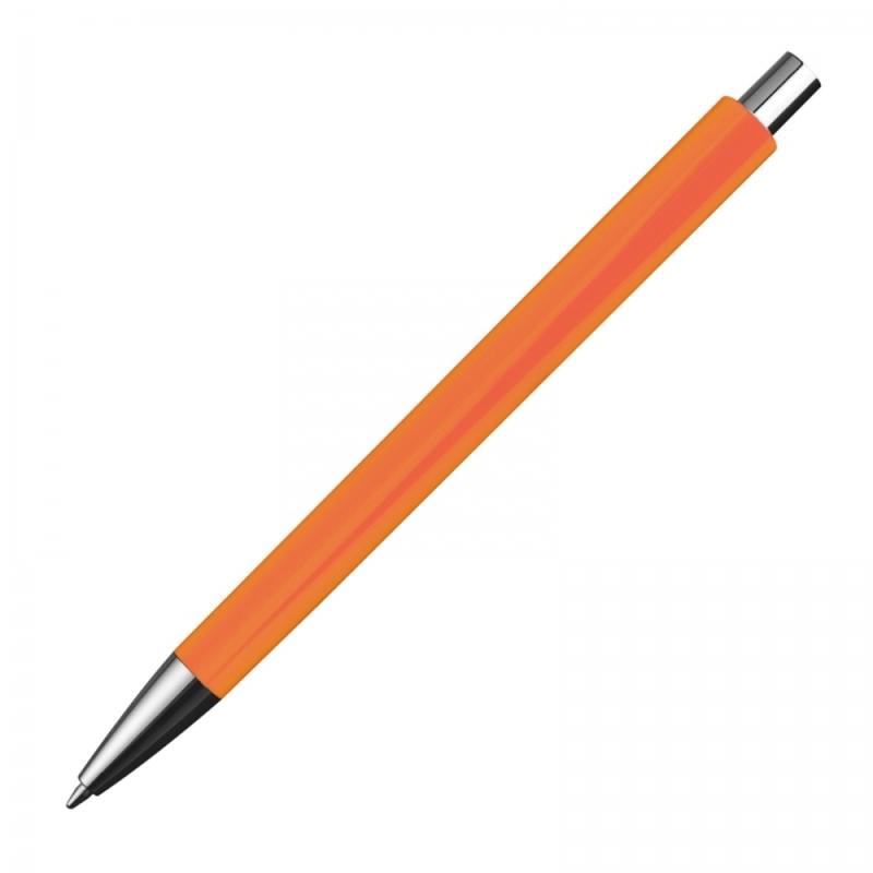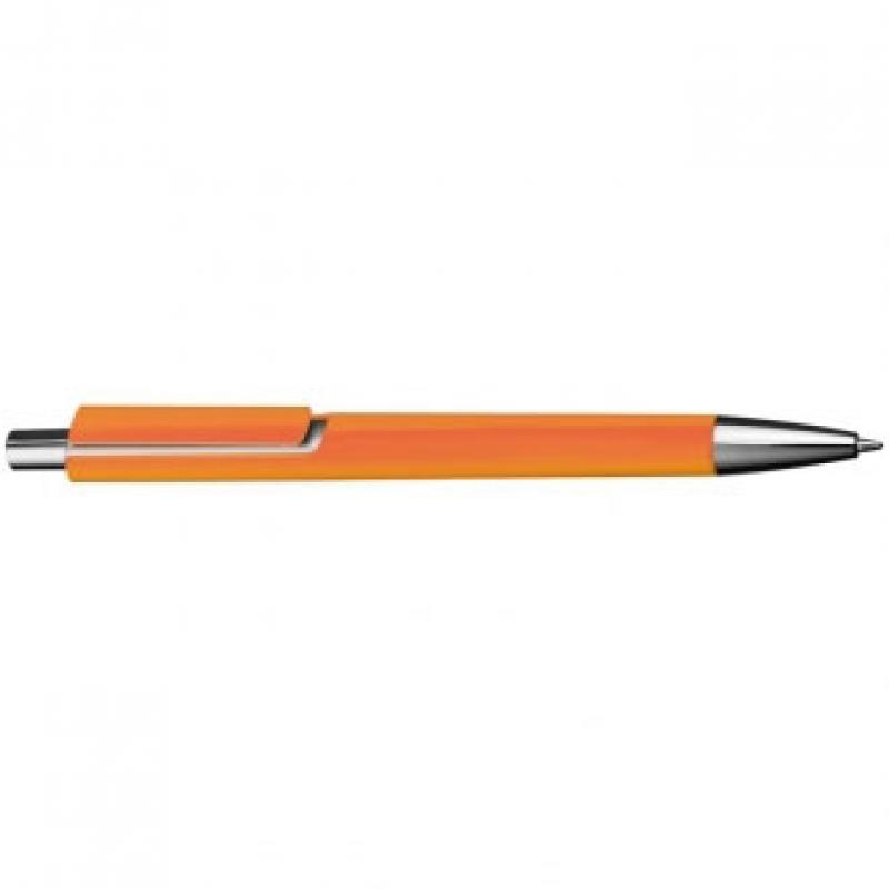 Plastikowy długopis z wkładem piszącym na niebiesko i srebrną aplikacją pod klipem.