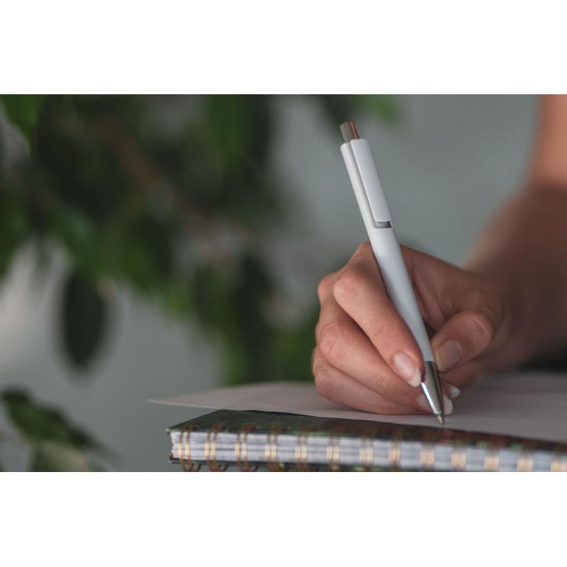 Plastikowy długopis z wkładem piszącym na niebiesko i srebrną aplikacją pod klipem.