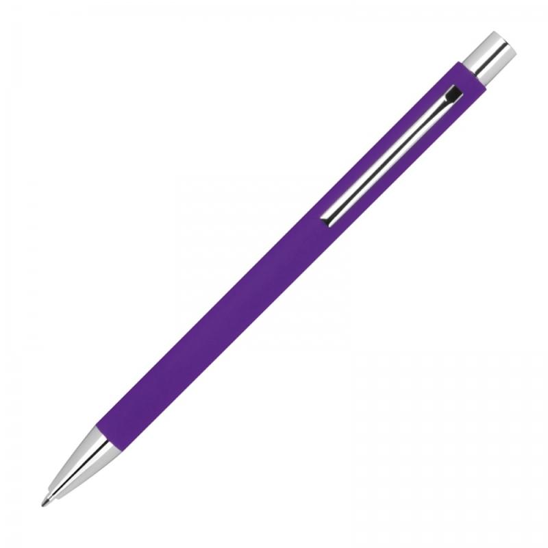 Smukły, metalowy długopis z powierzchnią soft touch, srebrnymi elementami i niebieskim wkładem.