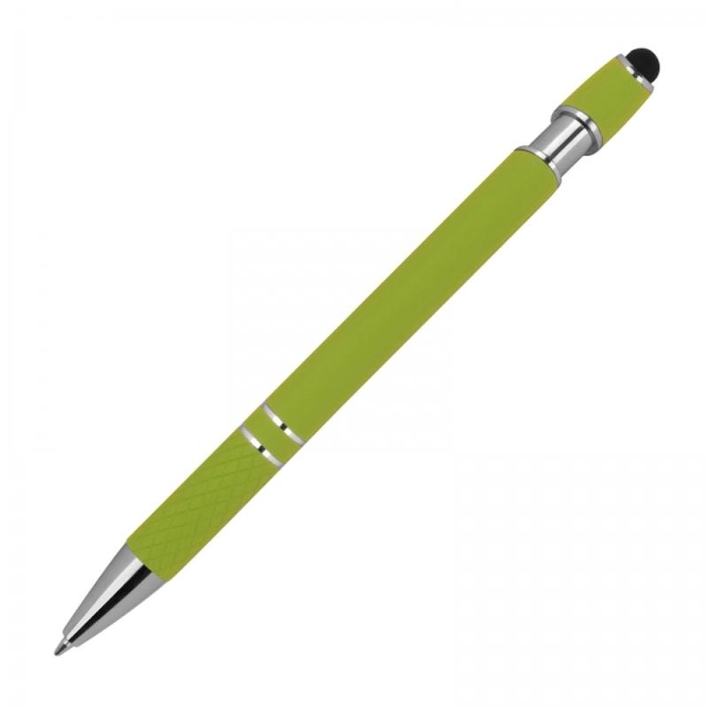 Aluminiowy długopis ze srebrnymi elementami, niebieskim wkładem, końcówką touch pen do obsługi ekranów dotykowych i gumową strefą uchwytu.