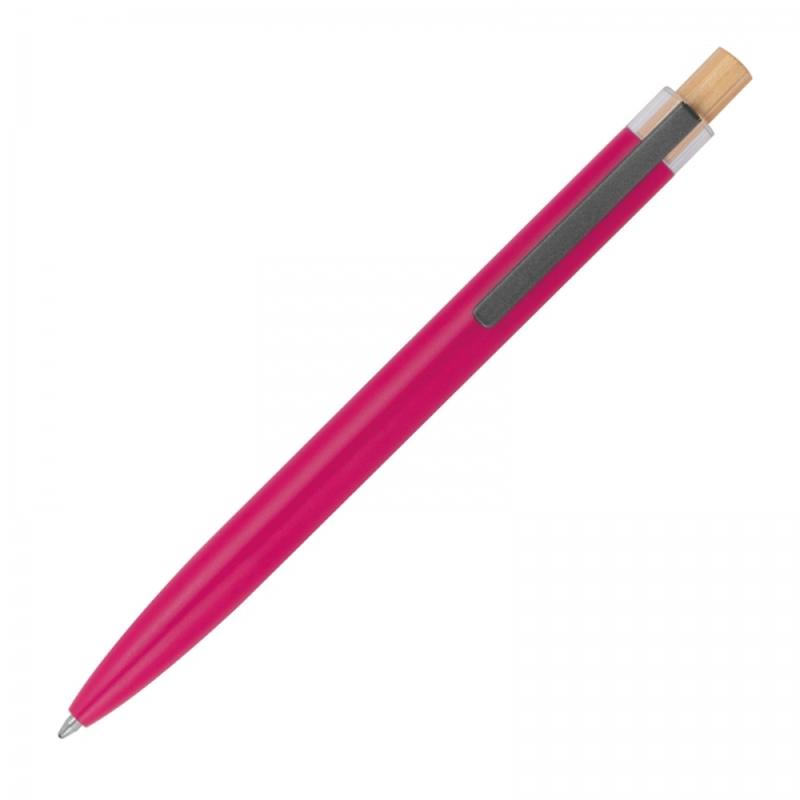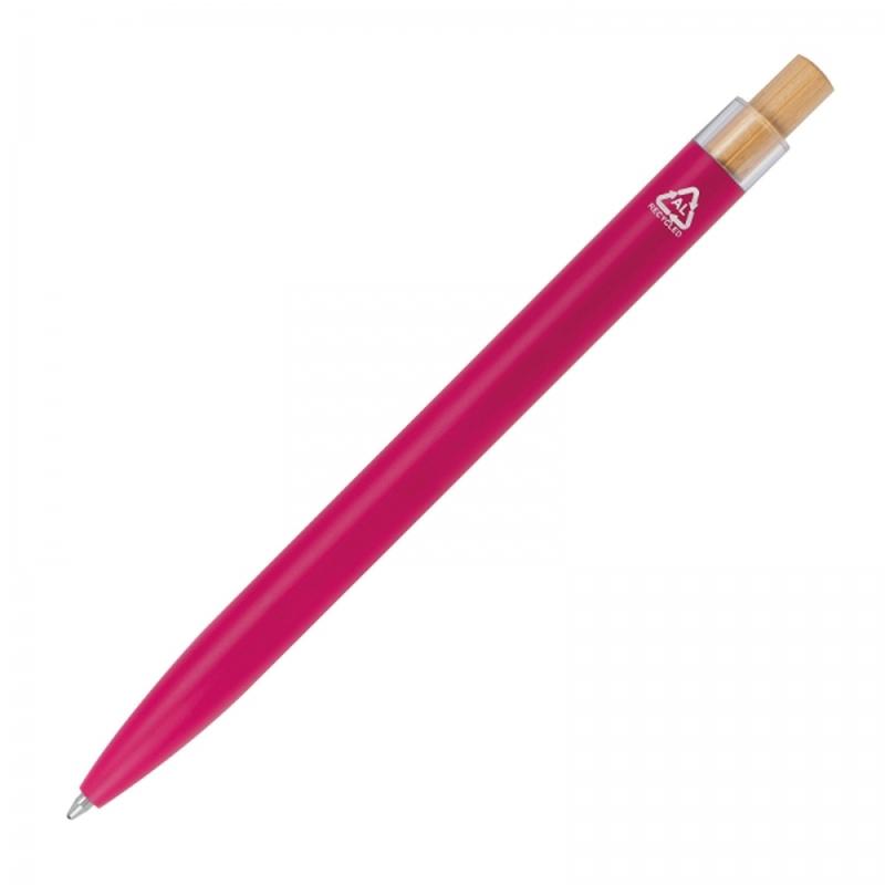 Długopis wykonany z aluminium pochodzącego z recyklingu, z niebieskim wkładem i bambusowym przyciskiem. Długopis wykonano z solidnego materiału, a dzięki odpowiedniemu ciężarowi, jest wyjątkowo wytrzymały i dobrze wyważony w dłoni. Powłoka długopisu gładka w dotyku, matowa.