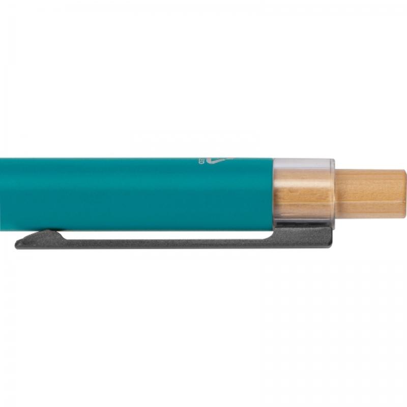 Długopis wykonany z aluminium pochodzącego z recyklingu, z niebieskim wkładem i bambusowym przyciskiem. Długopis wykonano z solidnego materiału, a dzięki odpowiedniemu ciężarowi, jest wyjątkowo wytrzymały i dobrze wyważony w dłoni. Powłoka długopisu gładka w dotyku, matowa.