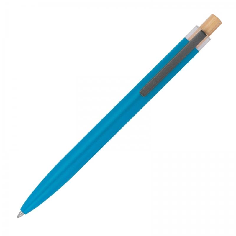 Długopis wykonany z aluminium pochodzącego z recyklingu, z niebieskim wkładem i bambusowym przyciskiem. Długopis wykonano z solidnego materiału, a dzięki odpowiedniemu ciężarowi, jest wyjątkowo wytrzymały i dobrze wyważony w dłoni. Powłoka długopisu gładka w dotyku, matowa.
