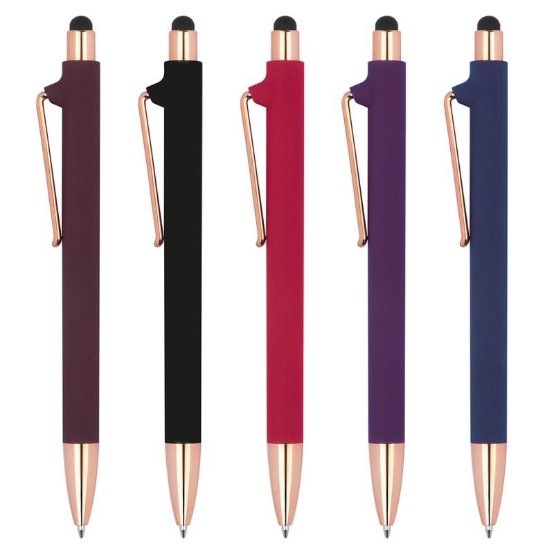 Długopis plastikowy z przyjemną w dotyku, gumową powłoką, niebieskim wkładem oraz elementami w złotym kolorze. Końcówka długopisa posiada również funkcję touch pen.