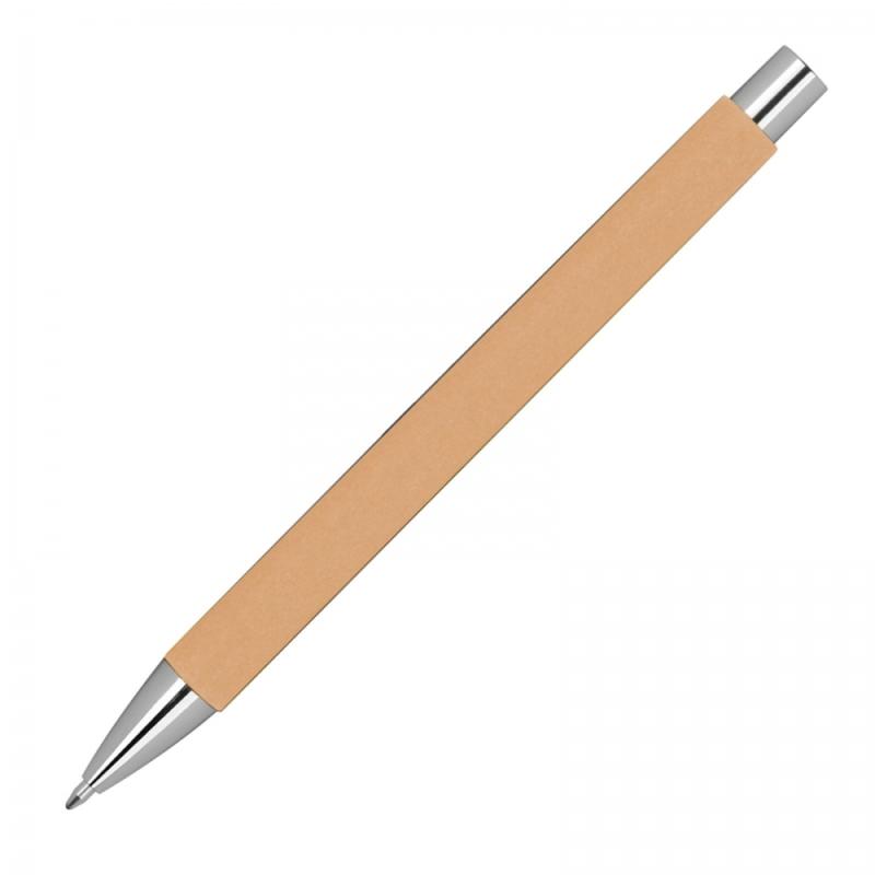 Przyjazny środowisku długopis, wykonany z papieru z metalowymi elementami, piszący na niebiesko.