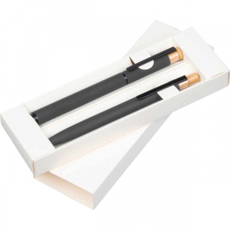 Zestaw piśmienny składający się z piszącego na niebiesko długopisu i pióra kulkowego, wykonany z aluminium z recyklingu. Całość zapakowana w pudełko.