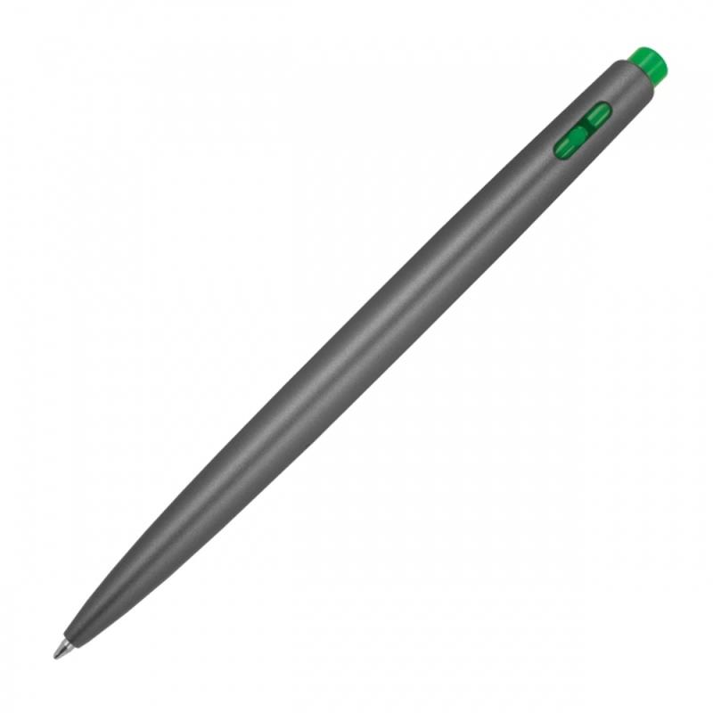 Długopis wykonany z plastiku z recyklingu, z kolorowymi akcenatami i wkładem piszącym na niebiesko.