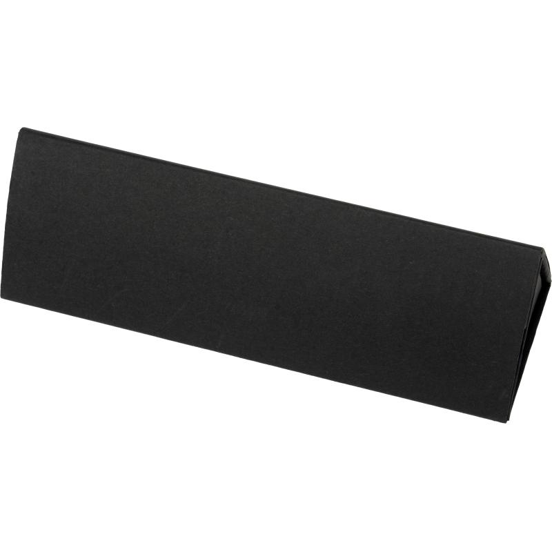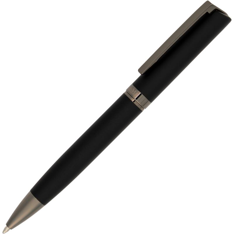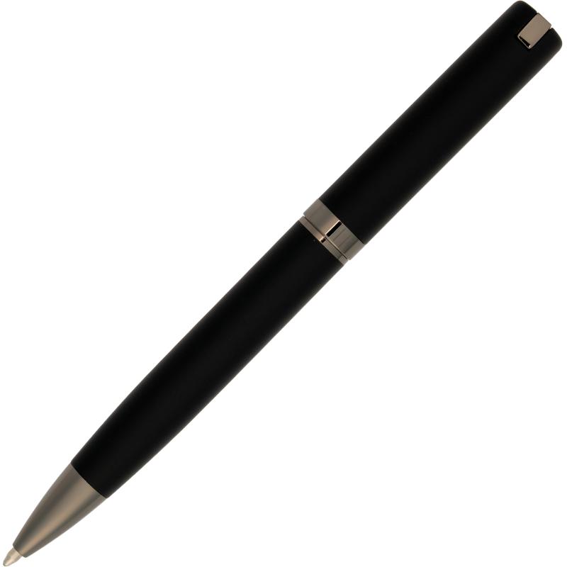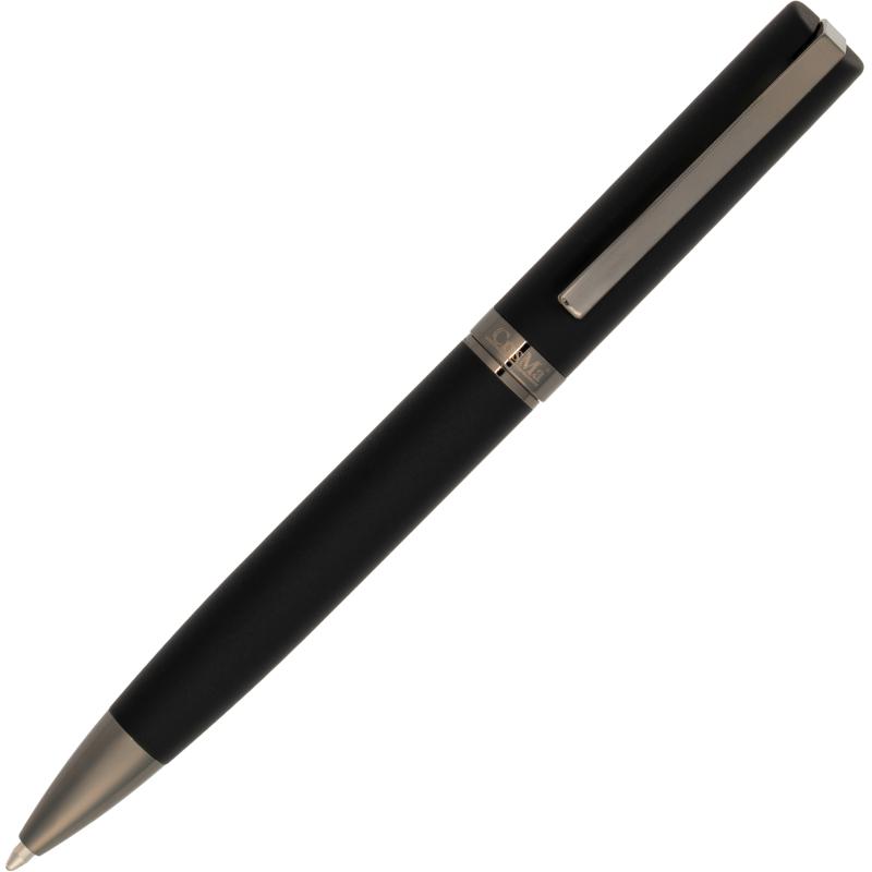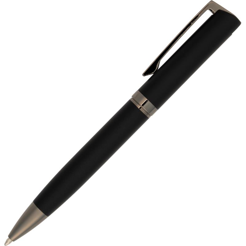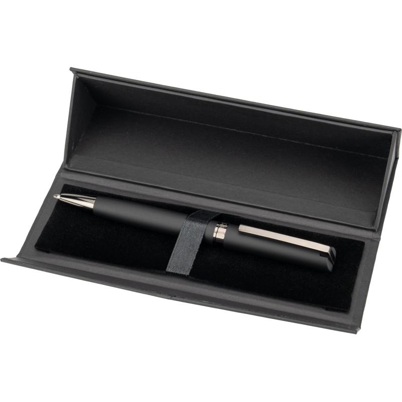 Przekręcany, metalowy długopis z gumową powierzchnią i niebieskim wkładem.