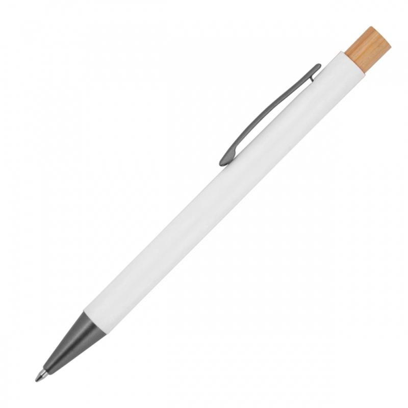 Długopis wykonany z aluminium z recyklingu, bambusowym przyciskiem, metalowym klipsem i wkładem piszącym na niebiesko.