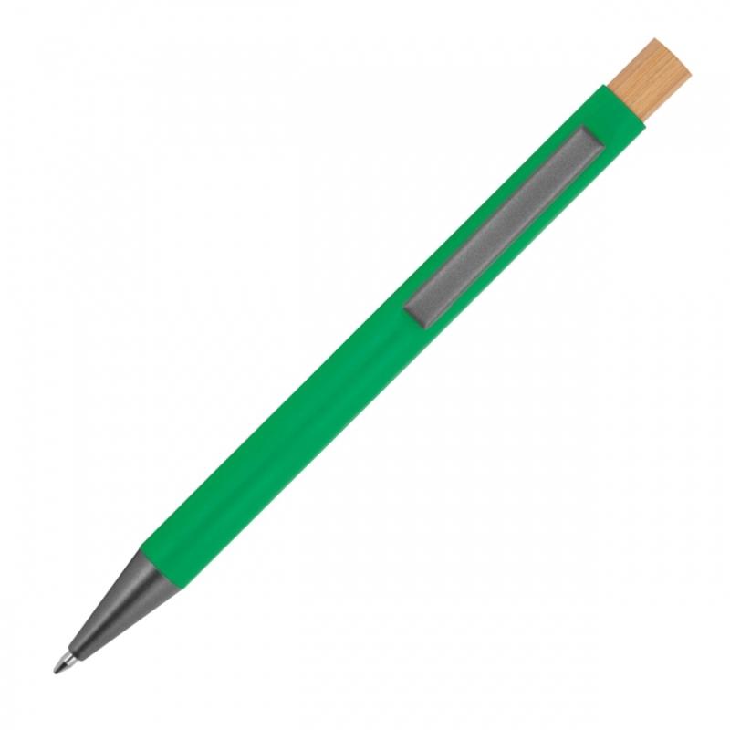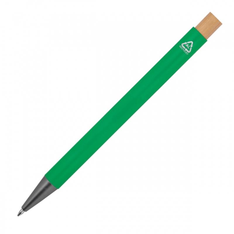Długopis wykonany z aluminium z recyklingu, bambusowym przyciskiem, metalowym klipsem i wkładem piszącym na niebiesko.